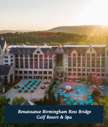 Experience the allure of Renaissance Birmingham Ross Bridge Golf Resort & Spa. With a scenic location near Hoover, Alabama, our hotel in Birmingham, AL ensures you're never far from things to see and do. On site, you'll find the fifth-longest golf course in the world at 8,191 yards and 18 holes, as well as beautiful ballroom space and a full-service spa, The Spa at Ross Bridge. Following an exciting day, retreat to one of our stylish rooms and suites, each equipped with elegant furnishings, luxurious bedding and a private balcony boasting astonishing views of the Alabama hills. After a relaxing evening, wake up with an appetite for savory dishes from any of our upscale restaurants and bars including Brock's, The Clubhouse Restaurant and JT's Lounge. When you're not indulging, release some of your energy at our 24-hour fitness center. We also feature sparkling indoor and outdoor pools, so you can make a splash every season of the year.