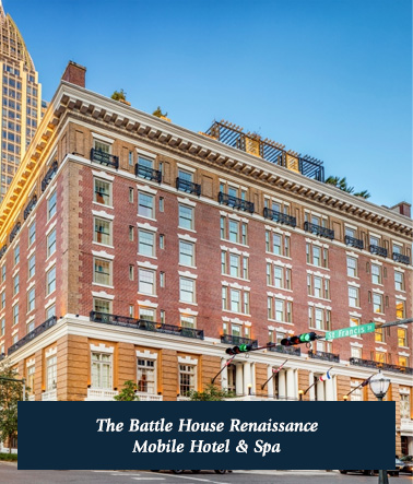 Embark on unforgettable travels at The Battle House Renaissance Mobile Hotel & Spa. We place you in the heart of downtown, near an array of attractions such as the USS Alabama Battleship Memorial Park, Mobile Civic Center and Mobile Alabama Cruise Terminal. After an adventurous outing, treat yourself to a rejuvenating massage and facial at our full-service spa. Experience even more relaxation in our accommodations boasting Southern style, complimentary Wi-Fi, plush bedding and room service. Once you've worked up an appetite, visit one of our three on-site restaurants serving everything from comfort food to fine dining entrees. Maximize your stay by enjoying a swim in our rooftop pool or a playing a friendly tennis match on our court. Our 16 event venues offer a contemporary backdrop for anything from an elegant wedding reception to a sprawling business convention.
